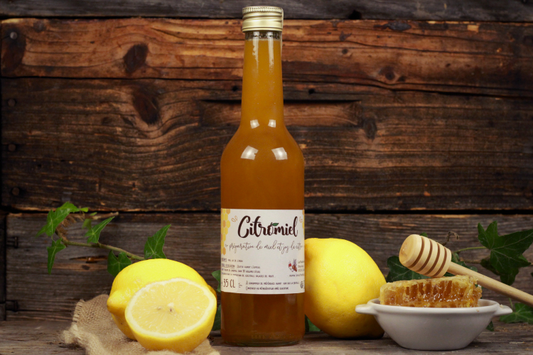 Le Citromiel est une préparation maison à base de citron et de notre bon miel, à diluer tel un sirop. Il s’adapte à toutes les situations : avec de l’eau plate ou pétillante, de la limonade, du vin blanc ou du champagne, mais aussi en coulis sur des crêpes, dans la tisane, la salade de fruit…